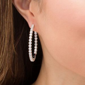 Add sparkle to your look with these gorgeous diamond hoop earrings. Crafted in cool 10K white gold, each exquisite earring features a row of 1/20 carat diamonds along the outer front and inner back edges, each set in a cupped four-prong setting. The earrings feature 3 carats of sparkling diamonds, polished to a brilliant finish, and fastened with a hinged back.