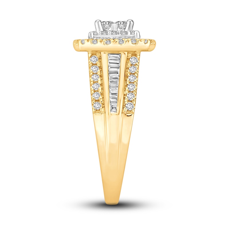This gorgeous two-tone engagement ring showcases four stunning princess-cut diamonds at its center, set in iconic 14K white gold. Brilliant round diamonds halo the center diamonds, and another frame of round diamonds set in 14K yellow gold brings a beautiful contrast. The band sparkles with round and baguette-cut diamonds, giving the ring a total diamond weight of 1 carat.